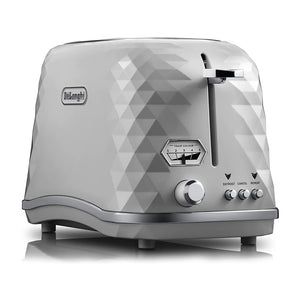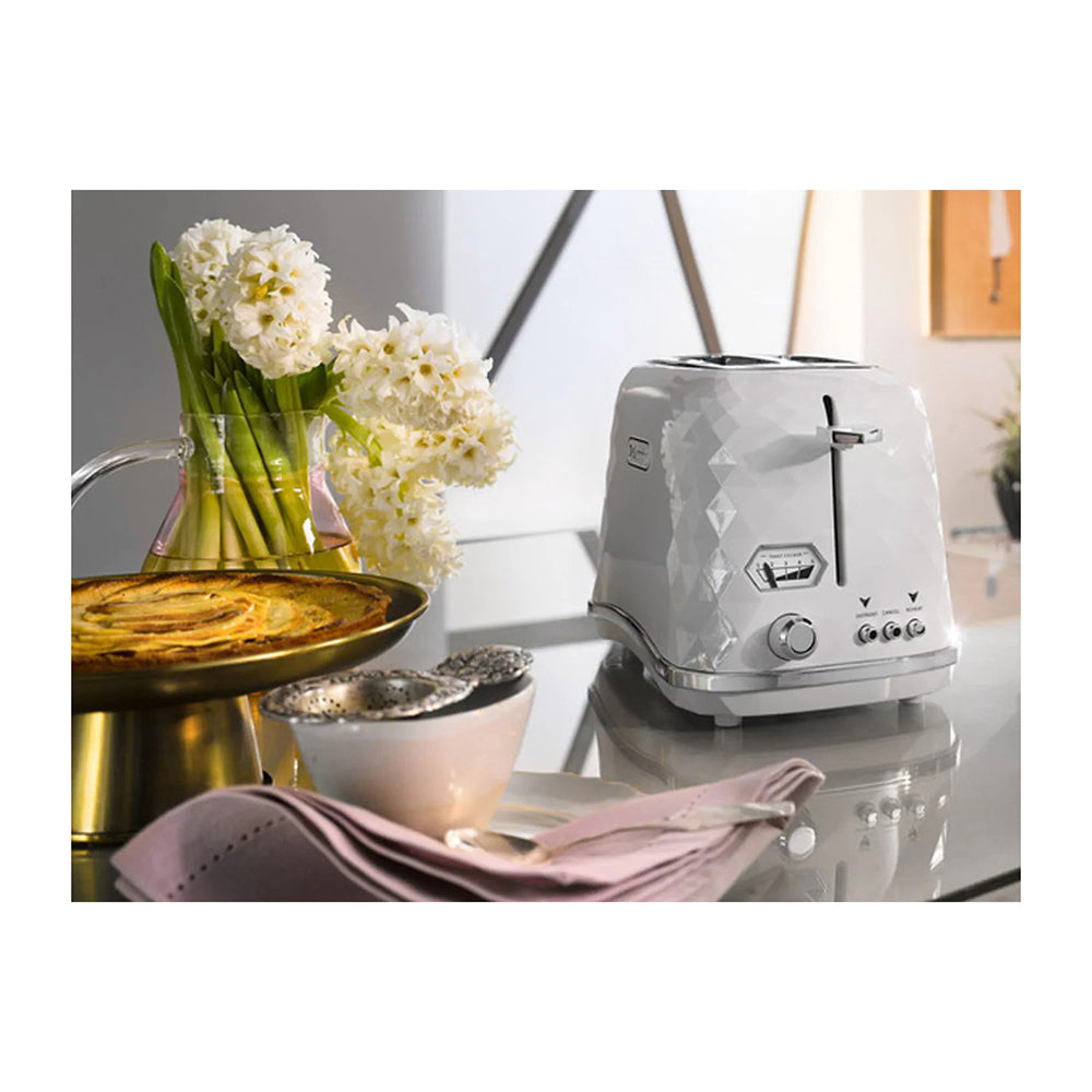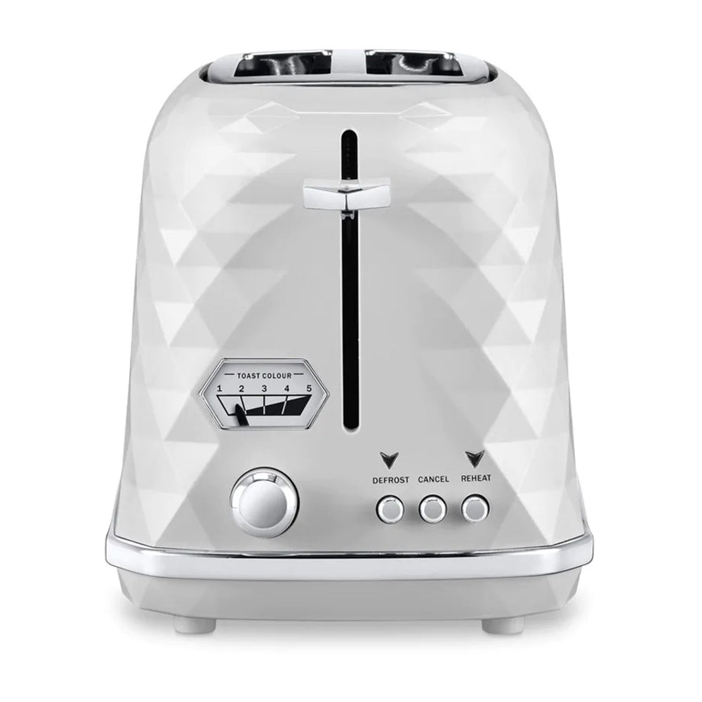 DeLonghi CTJX2003W Brilliante 2-slice toaster with a beautiful faceted design and chrome details is sure to add a balance of modernity to your living spaces. It has a classic white finish that sits well with most kitchen themes.