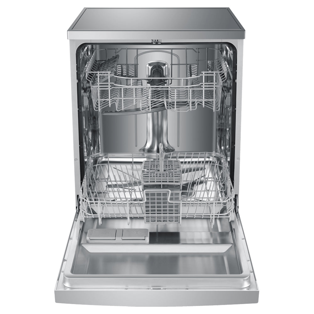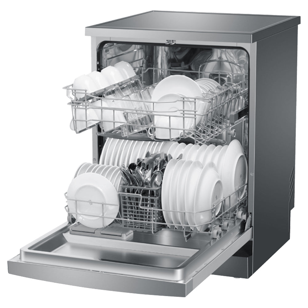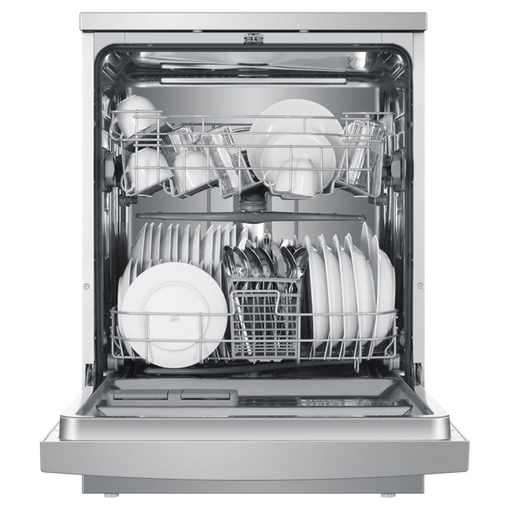The HDW13V1S1 silver dishwasher is equipped with a height-adjustable upper basket and offers 13 place settings to customise the interior. It will help you fit a variety of dishes conveniently and get efficient cleaning results. This dishwashing machine also lets you set the Key Lock for peace of mind or use the Delay Start function to schedule the dishwashing to meet your lifestyle needs.
